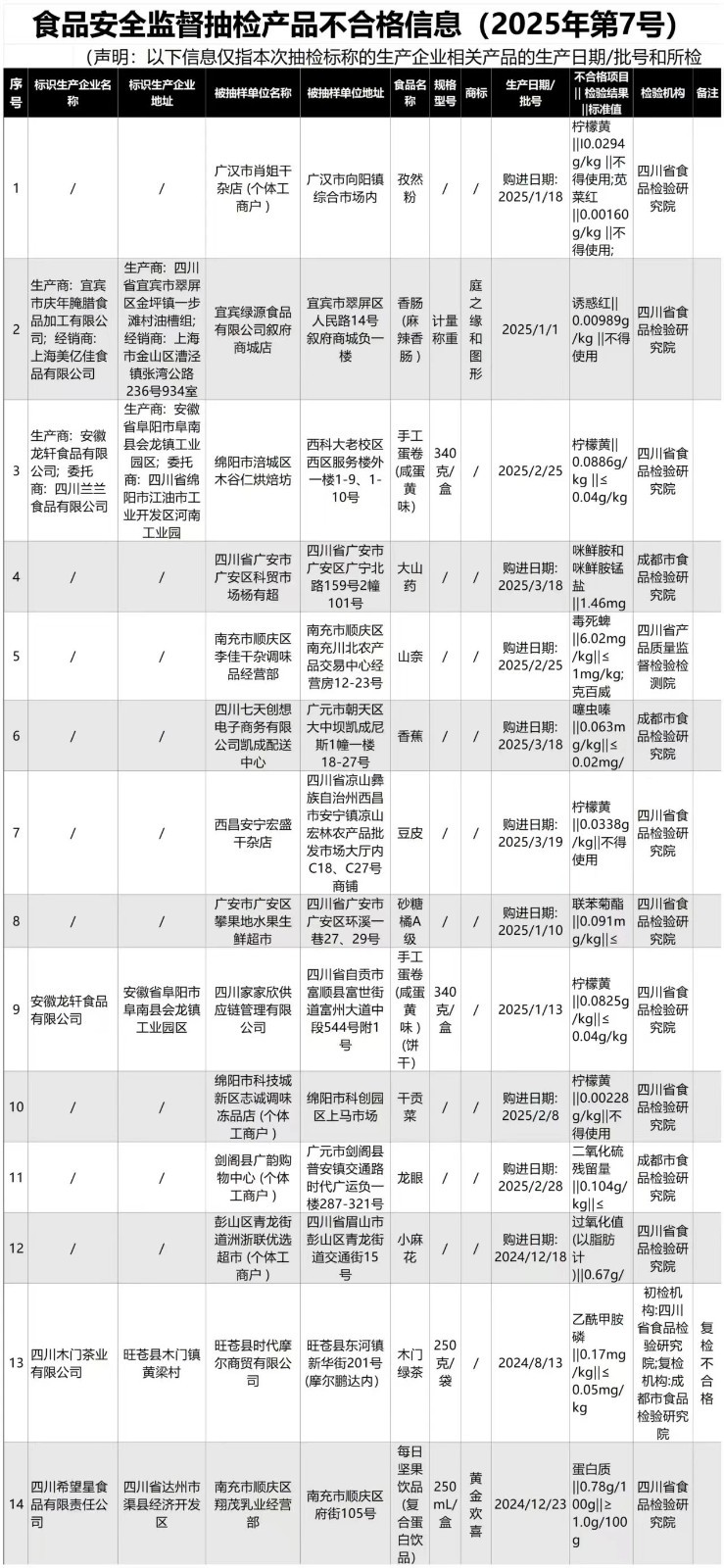 四川食品安全监督抽检结果公布:14批次食品不合格
